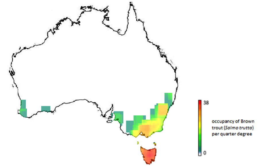 Alternatively, the country may be divided into geographic grid cells of, for example, a quarter degree. If a species is known to be present from 10 of these cells, then it has an occupancy of 10 at a quarter degree scale. This example shows how many records in the Atlas of Living Australia (www.ala.org.au) there are of brown trout (Salmo trutta) in Australia within each quarter degree grid cell (scaled colour bar).